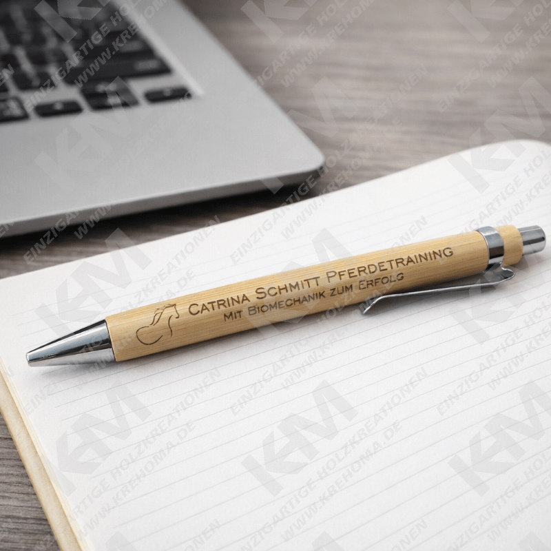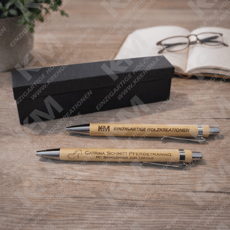 Dieser elegante Kugelschreiber aus Bambus verbindet schlichtes Design mit persönlicher Note. Durch die individuelle Gravur wird aus einem alltäglichen Schreibgerät ein besonderes Einzelstück, das man gern zur Hand nimmt. Ob Name, Initialen, ein kurzes Wort oder eine kleine Widmung – dein Wunschtext wird sauber und dauerhaft eingraviert und macht den Kugelschreiber unverwechselbar.