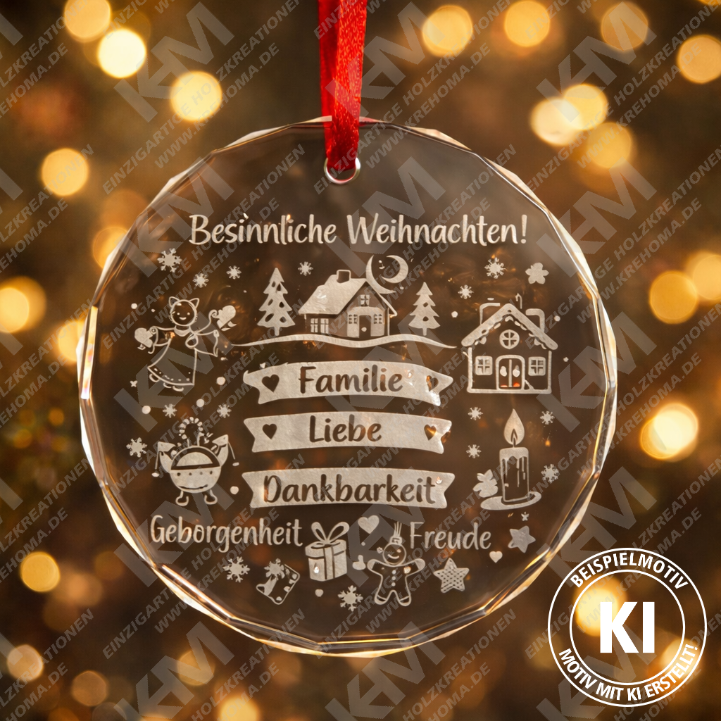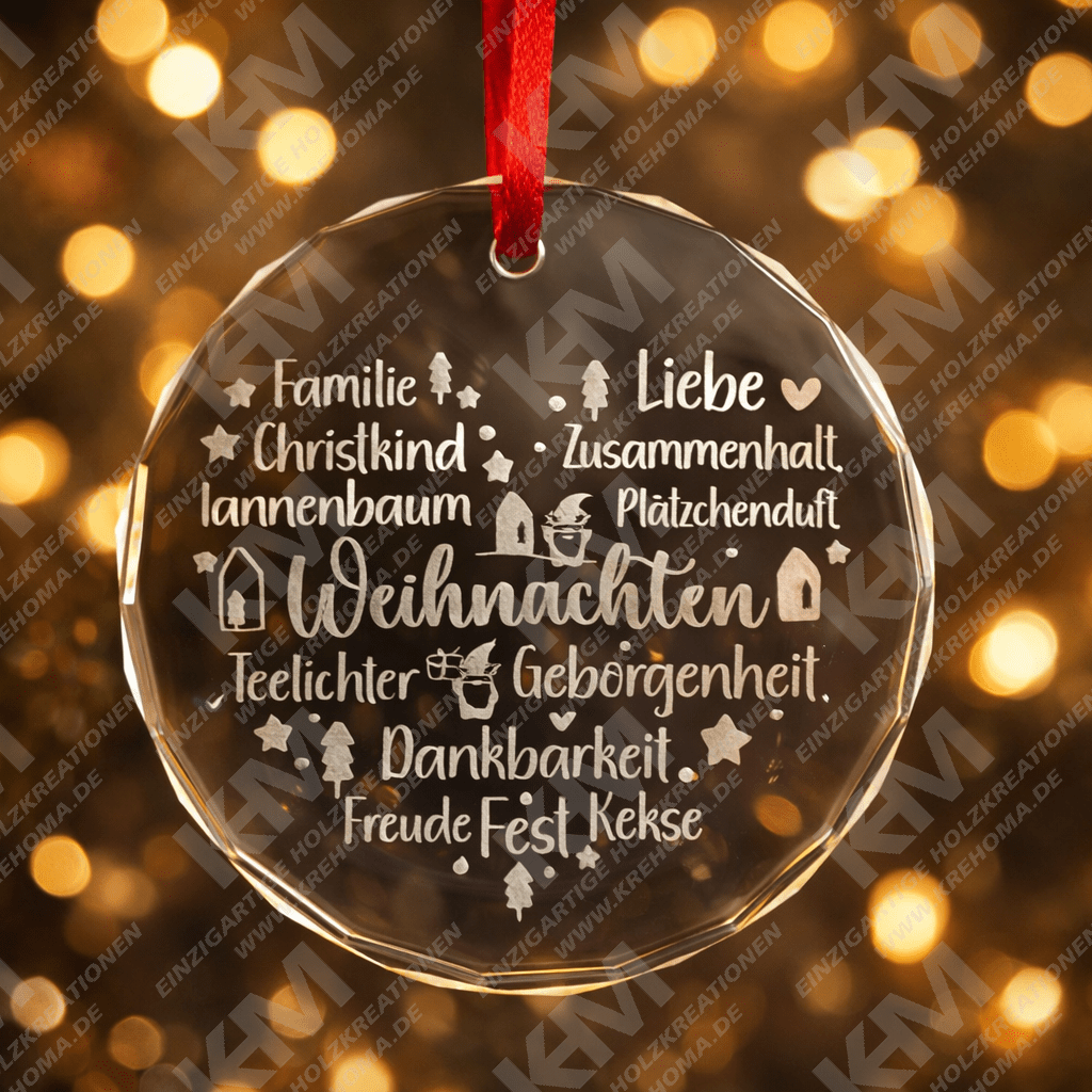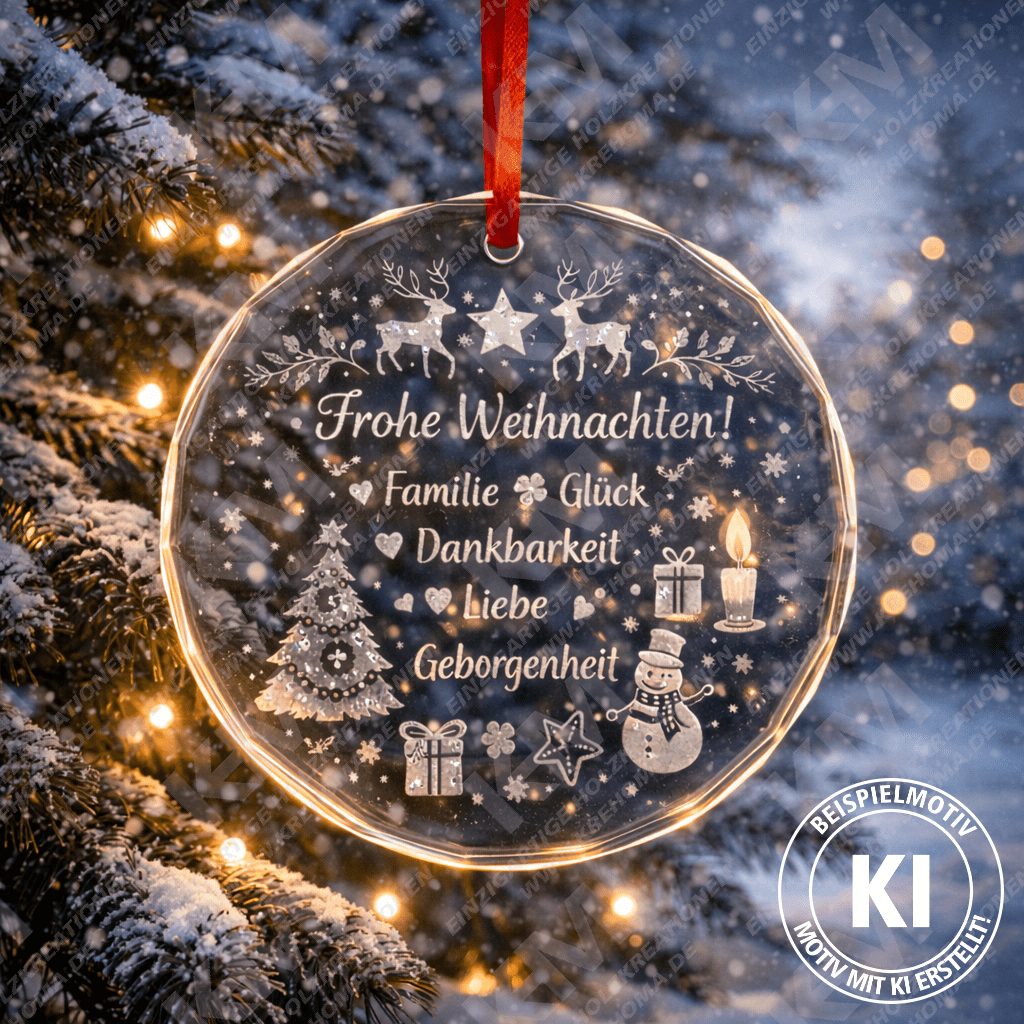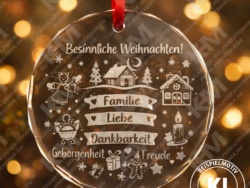 Dieses elegante, runde Glasornament ist ein stilvolles und persönliches Deko‑Highlight – perfekt als Geschenk für Familie, Freunde oder deinen Weihnachtsbaum. Das Ornament wird mit deinem Wunschtext (z. B. Namen, Datum oder kurzer persönliche Botschaft) fein graviert. Ob als Erinnerung an ein besonderes Jahr, als liebevolle Botschaft oder schlicht als hübsche Deko – dieses Glasornament ist ein kleines Kunstwerk für dein Zuhause.