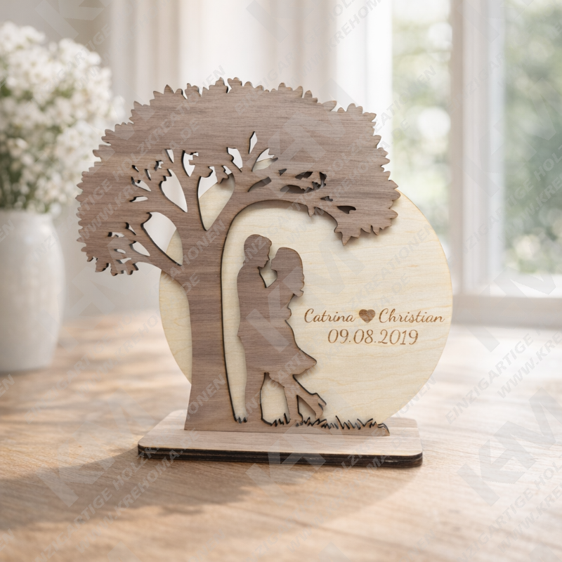 Dieser romantische Liebespaar Holzaufsteller ist mehr als nur ein Dekoartikel – sie erzählt eure ganz persönliche Geschichte. Mit Namen und Datum graviert, entsteht ein liebevolles Erinnerungsstück, das besondere Momente für immer festhält. Ob auf dem Regal, der Kommode oder als Blickfang im Wohnzimmer: Die warme Ausstrahlung des Holzes sorgt sofort für eine gemütliche und emotionale Atmosphäre.